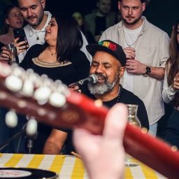 De band speelt midden in het publiek, zonder podium, waardoor een directe en betrokken beleving ontstaat. Deze opstelling zorgt voor een intieme setting waarin bezoekers niet alleen toeschouwer zijn, maar actief onderdeel worden van de beleving.
